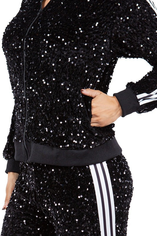 Sexy sequins set casual jacket, front zipper up, long sleeves, side pocket, elasticized waist pant